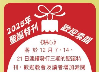 《耕心》將於12月7、14、21日連續發行三期的聖誕特刊, 歡迎教會及讀者增加索閱份數,藉聖誕節期分發社區及親朋好友傳福音。