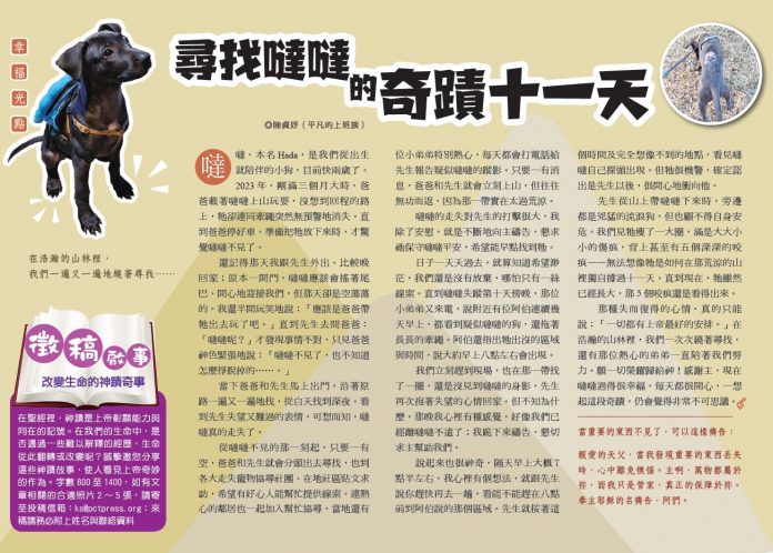 那種失而復得的心情,真的只能說:「一切都有上帝最好的安排。」在浩瀚的山林裡,我們一次次繞著尋找,還有那位熱心的弟弟一直陪著我們努力。願一切榮耀歸給神!感謝主,現在噠噠過得很幸福,每天都很開心,一想起這段奇蹟,仍會覺得非常不可思議。