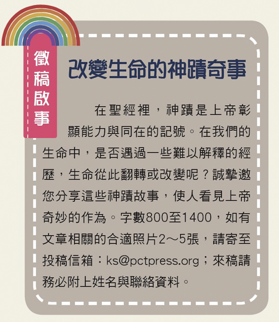 這時妻子碧雪的姊姊說:「只能去信耶穌,看看上帝是不是可以醫治妳?」於是我們第一次正式邀請岳母:「媽媽,要不要來信耶穌呢?」但她立刻揮揮手:「不可能啦!我拜拜幾十年了,要我不拜去信耶穌,我沒辦法。」