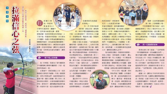 今年8月的一場比賽,我和學妹們組了團體,由我擔任第一棒,這也是我最陌生的棒次。雖然每一棒都很重要,但是第一棒更需要自信和勇氣,才能把團隊氣勢帶起來,讓後面的棒次可以放心發揮。以前我總是擔任第三棒,只要穩穩上場,不怕秒數剩下很少就好。這次擔綱重要棒次,我在上場前再次向上帝禱告,求祂賜給我勇氣。當比賽正式開始倒數計時那一刻,我站上發射線,感到內心剛強勇敢,不再緊張,自信滿滿地把箭射出去。