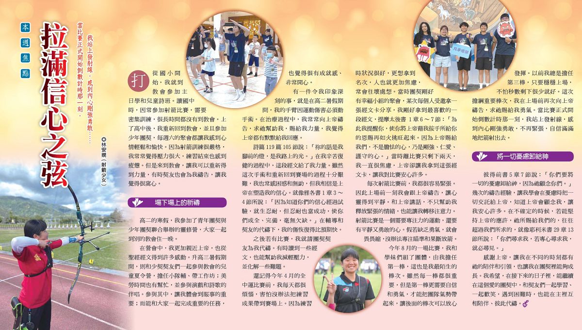 打從國小開始,我就到教會參加主日學和兒童詩班。讀國中時,因常參加射箭比賽,需要密集訓練,很長時間都沒有到教會。上了高中後,我重新回到教會,並且參加少年團契,每週六的聚會都讓我感到心情輕鬆和愉快。因為射箭訓練很嚴格,我常常覺得壓力很大,練習結束也感到疲憊。但是來到教會,讓我可以重新得到力量,有時契友也會為我禱告,讓我覺得很窩心。
