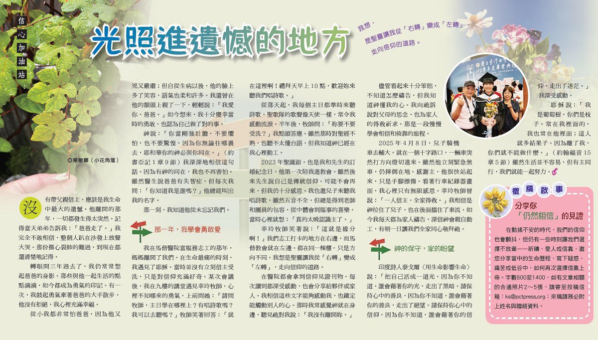 在醫院都會拿到信仰見證刊物,每次讀到都深受感動,也會分享給夥伴或家人。我相信這些文字能夠感動我,也鐵定能觸動別人的心。那時我常感覺神就在身邊,聽見祂對我說:「我沒有離開妳。」