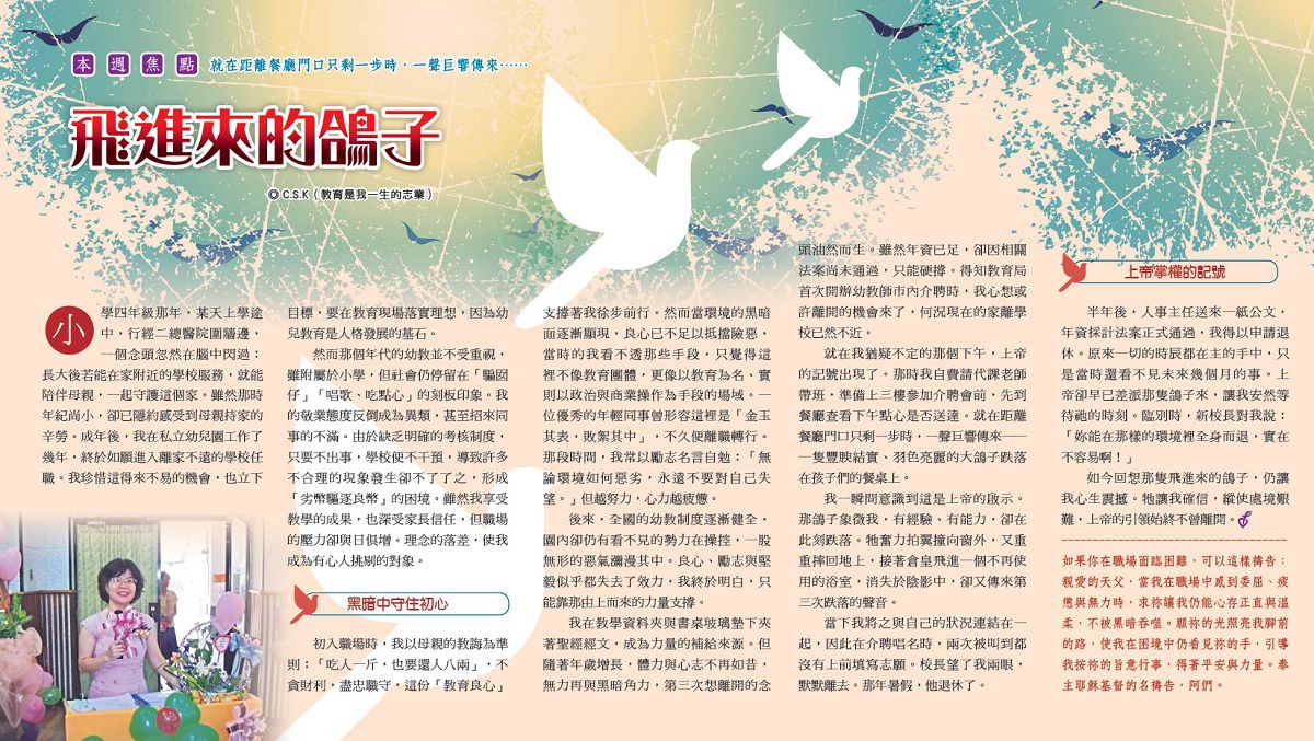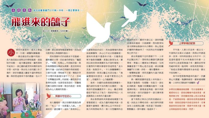 半年後,人事主任送來一紙公文,年資採計法案正式通過,我得以申請退休。原來一切的時辰都在主的手中,只是當時還看不見未來幾個月的事。上帝卻早已差派那隻鴿子來,讓我安然等待祂的時刻。臨別時,新校長對我說:「妳能在那樣的環境裡全身而退,實在不容易啊!」