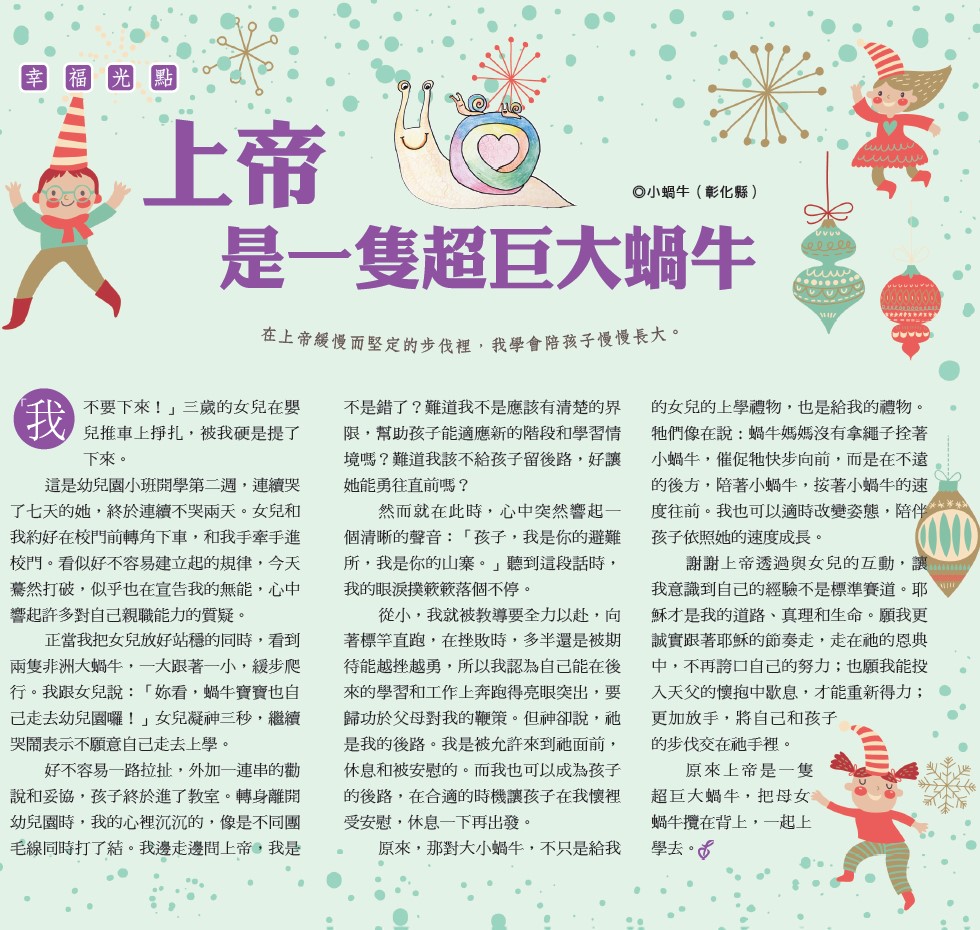 原來,那對大小蝸牛,不只是給我的女兒的上學禮物,也是給我的禮物。牠們像在說:蝸牛媽媽沒有拿繩子拴著小蝸牛,催促牠快步向前,而是在不遠的後方,陪著小蝸牛,按著小蝸牛的速度往前。我也可以適時改變姿態,陪伴孩子依照她的速度成長。