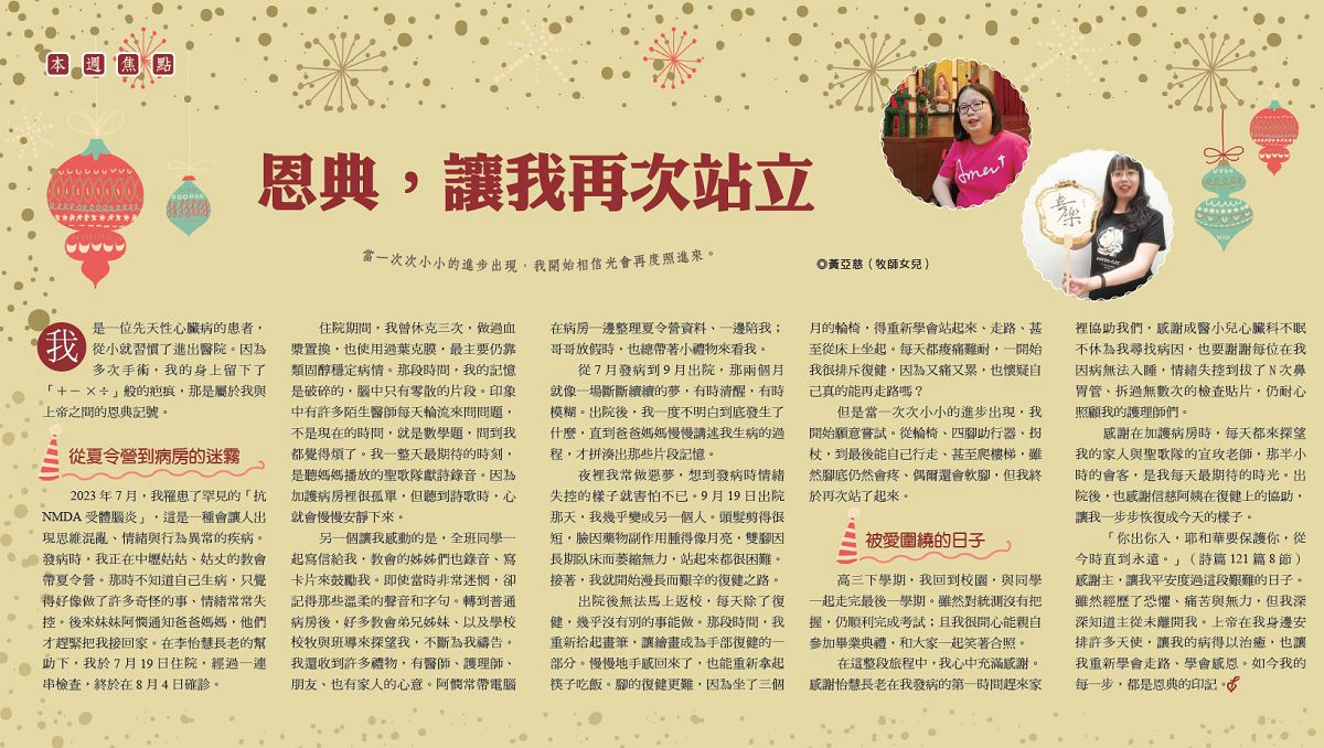 2023年7月,我罹患了罕見的「抗NMDA受體腦炎」,這是一種會讓人出現思維混亂、情緒與行為異常的疾病。發病時,我正在中壢姑姑、姑丈的教會帶夏令營。那時不知道自己生病,只覺得好像做了許多奇怪的事、情緒常常失控。後來妹妹阿憫通知爸爸媽媽,他們才趕緊把我接回家。在李怡慧長老的幫助下,我於7月19日住院,經過一連串檢查,終於在8月4日確診。