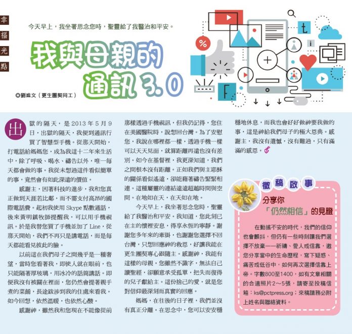 感謝主,因著科技的進步,我和您真正做到天涯若比鄰,而不需支付高昂的國際電話費。起初我使用Skype點數通話,後來黃明鎮牧師提醒我,可以用手機視訊。於是我替您買了手機並加了Line,從那天開始,我們不再只是講電話,而是每天都能看見彼此的臉。