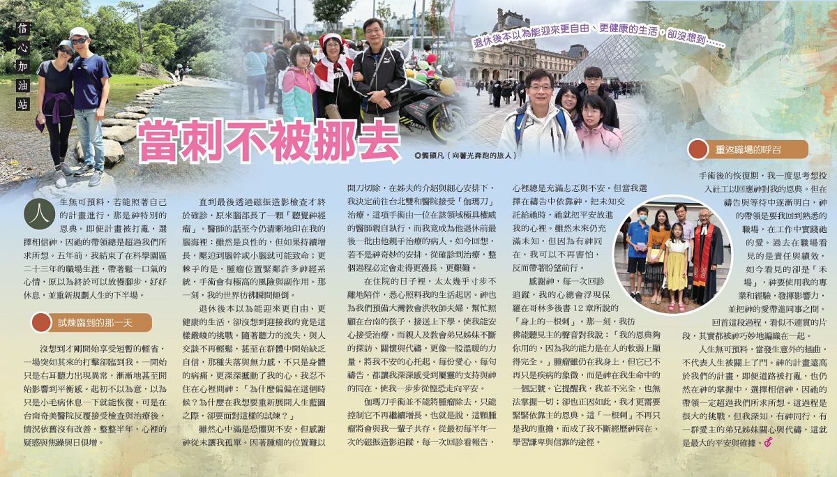 感謝神,每一次回診追蹤,我的心總會浮現保羅在哥林多後書12章所說的「身上的一根刺」。那一刻,我彷彿能聽見主的聲音對我說:「我的恩典夠你用的,因為我的能力是在人的軟弱上顯得完全。」腫瘤雖仍在我身上,但它已不再只是疾病的象徵,而是神在我生命中的一個記號。它提醒我,我並不完全,也無法掌握一切;卻也正因如此,我才更需要緊緊依靠主的恩典。這「一根刺」不再只是我的重擔,而成了我不斷經歷神同在、學習謙卑與信靠的途徑。