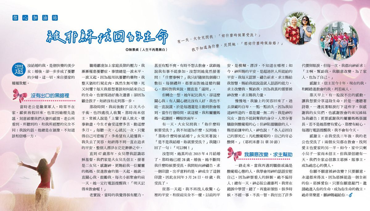 直到47歲那年,女兒帶我認識耶穌基督。我們家是大女兒先信主,接著是二女兒。感謝神,更賜給我一位屬靈的媽媽,從進教會的第一天起,她就一直關心我、鼓勵我。每次小組聚會的前一天,她一定打電話提醒我:「明天記得來教會喔!」