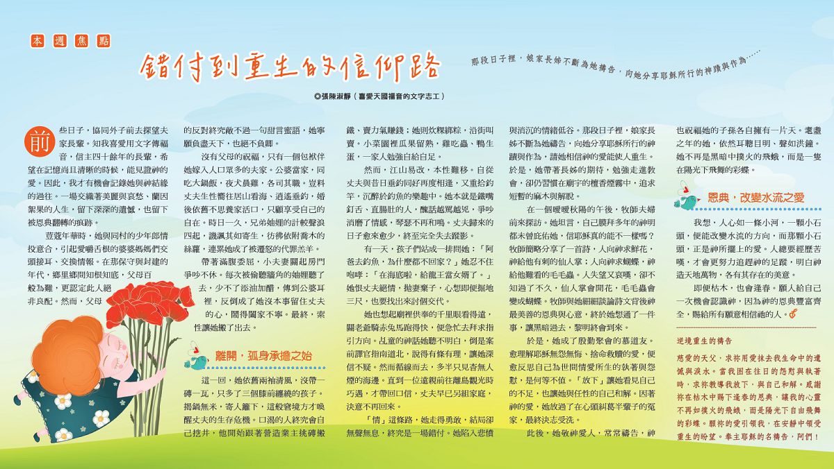 此後,她敬神愛人,常常禱告,神也祝福她的子孫各自擁有一片天。耄耋之年的她,依然耳聰目明、聲如洪鐘。她不再是黑暗中撲火的飛蛾,而是一隻在陽光下飛舞的彩蝶。