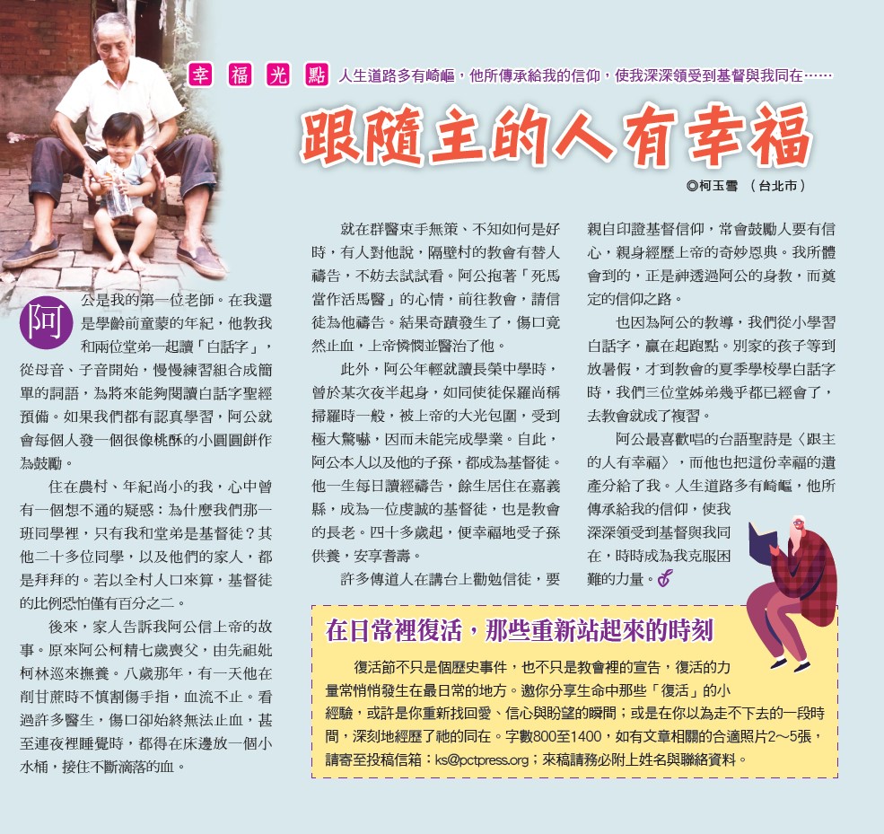 阿公最喜歡唱的台語聖詩是〈跟主的人有幸福〉,而他也把這份幸福的遺產分給了我。人生道路多有崎嶇,他所傳承給我的信仰,使我深深領受到基督與我同在,時時成為我克服困難的力量。
