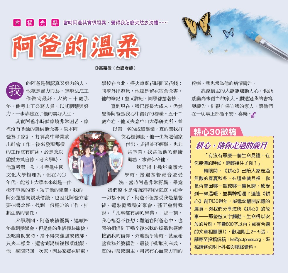直到現在,我已經長大成人,仍然覺得阿爸是我心中最好的榜樣。五十二歲左右,他又去念中山大學研究所,並以第一名的成績畢業,真的讓我打從心裡佩服。他一生為這個家付出,走得並不輕鬆,也非常辛苦。我常為他的健康禱告,求神保守他。