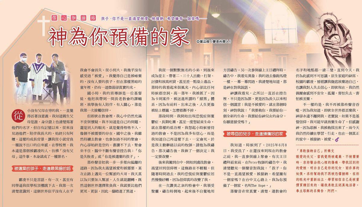 那聲音非常真實、清楚,連教會的名字和地點都一清二楚。直到今天,我仍為此感到不可思議。原生家庭的缺席、校園的霸凌,曾經讓我徹底放棄過自己,也讓我對人失去信心。即使現在,我仍然偶爾會感到不安全、孤獨,害怕失去、害怕被丟棄。
