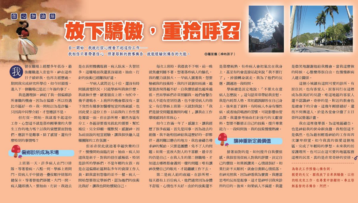 接著面對的是,如何提升自我價值感。我很容易從病人對我的評價,決定自己的價值。如果被讚美,心情就很好。如果打針不太順利,就會自責跟心情低落。但神光照我,因為神看我為寶貴。我應當思考的反而是服事,這才是神呼召我來診所的目的。後來,如果病人不滿意,我還是微笑地謝謝他給我機會。當我這麼做的時候,心態變得很自由,也慢慢跟病人建立關係。
