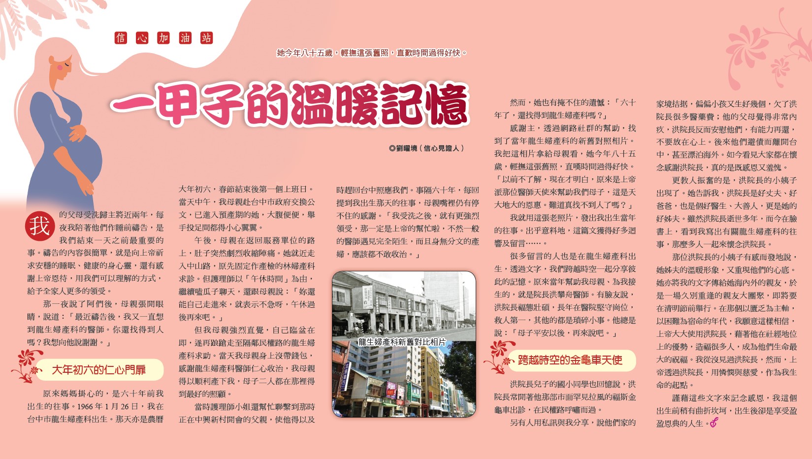 原來媽媽掛心的,是六十年前我出生的往事。1966年1月26日,我在台中市龍生婦產科出生。那天亦是農曆大年初六,春節結束後第一個上班日。當天中午,我母親赴台中巿政府交換公文,已進入預產期的她,大腹便便,舉手投足間都得小心翼翼。