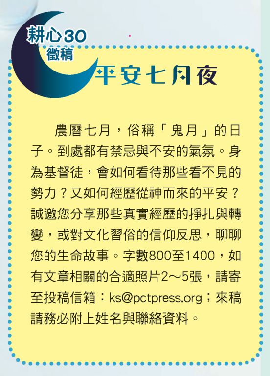 【活動訊息】 【耕心30徵稿】平安七月夜 2026年4月29日 0 1 在Facebook上分享 鳴叫在twitter 農曆七月,俗稱「鬼月」的日子。到處都有禁忌與不安的氣氛。身為基督徒,會如何看待那些看不見的勢力?又如何經歷從神而來的平安?誠邀您分享那些真實經歷的掙扎與轉變,或對文化習俗的信仰反思,聊聊您的生命故事。 字數800至1400,如有文章相關的合適照片2~5張。 請寄至投稿信箱:ks@pctpress.org;來稿請務必附上姓名與聯絡資料。 詳見:【投稿須知】