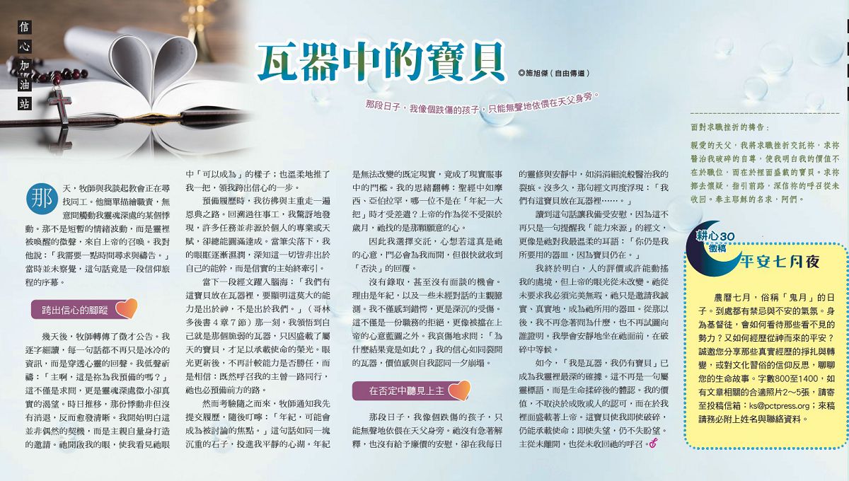 那段日子,我像個跌傷的孩子,只能無聲地依偎在天父身旁。祂沒有急著解釋,也沒有給予廉價的安慰,卻在我每日的靈修與安靜中,如涓涓細流般醫治我的裂痕。沒多久,那句經文再度浮現:「我們有這寶貝放在瓦器裡……。」