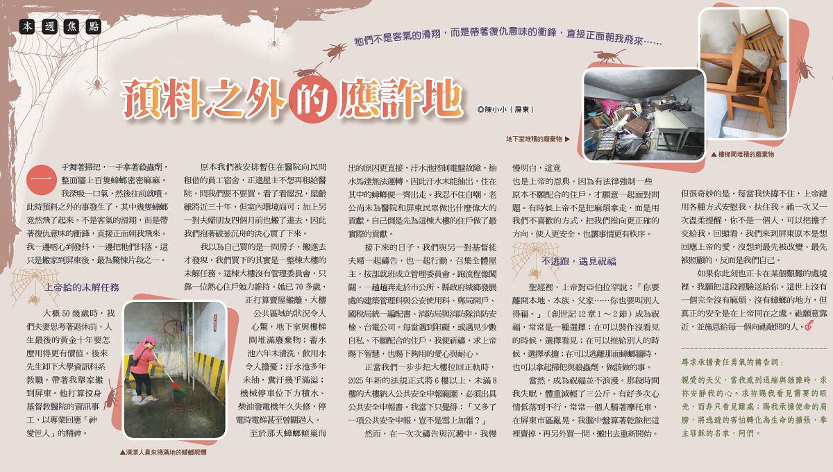 然而,在一次次禱告與沉澱中,我慢慢明白,這竟也是上帝的恩典。因為有法律強制一些原本不願配合的住戶,才願意一起面對問題。有時候上帝不是把麻煩拿走,而是用我們不喜歡的方式,把我們推向更正確的方向,使人更安全,也讓事情更有秩序。